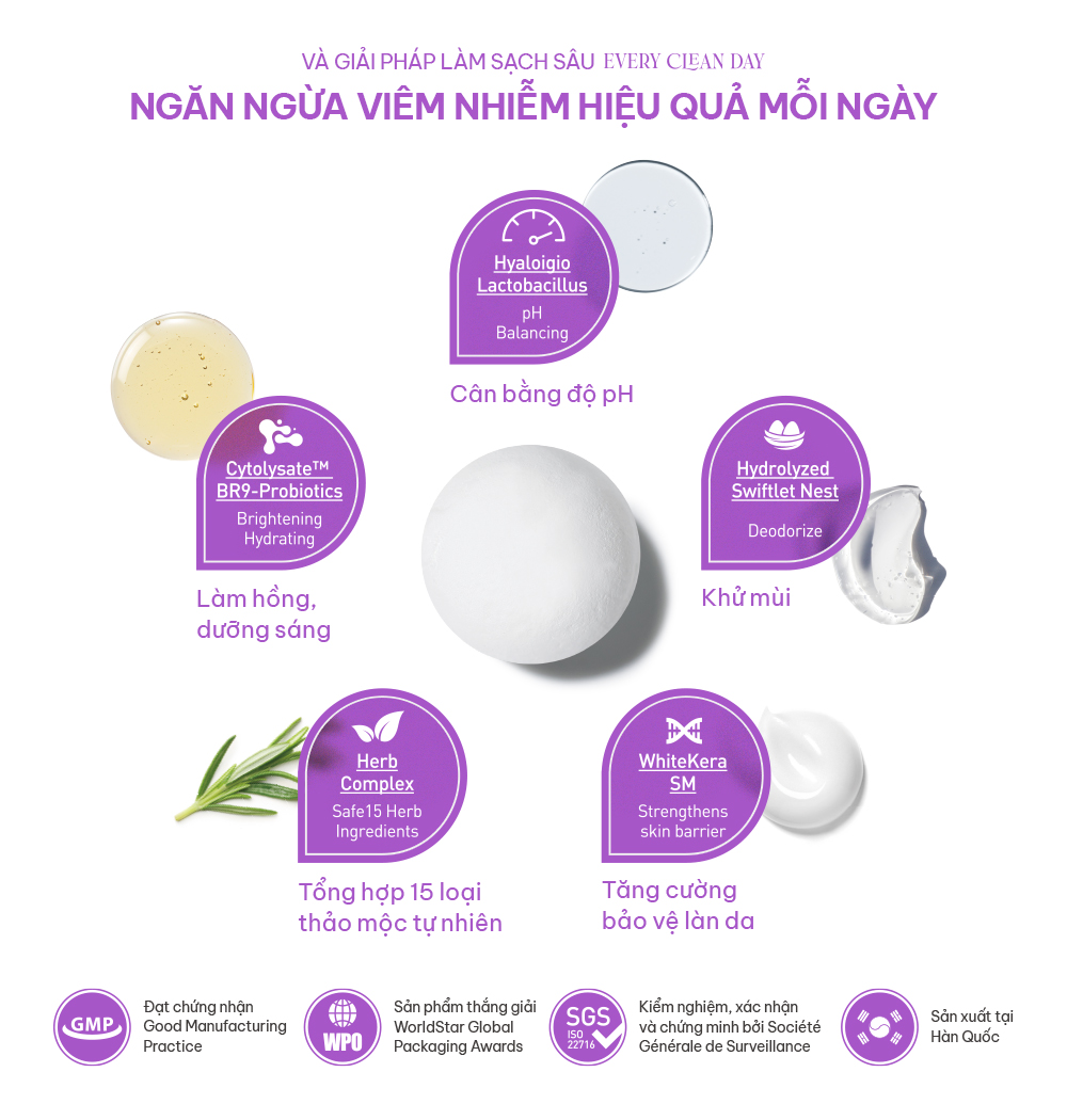 - Hiệu quả sử dụng: Hỗ trợ làm sạch, khử mùi, giảm ngứa và cân bằng độ pH, hỗ trợ điều trị viêm phụ khoa và củng cố hàng rào bảo vệ da