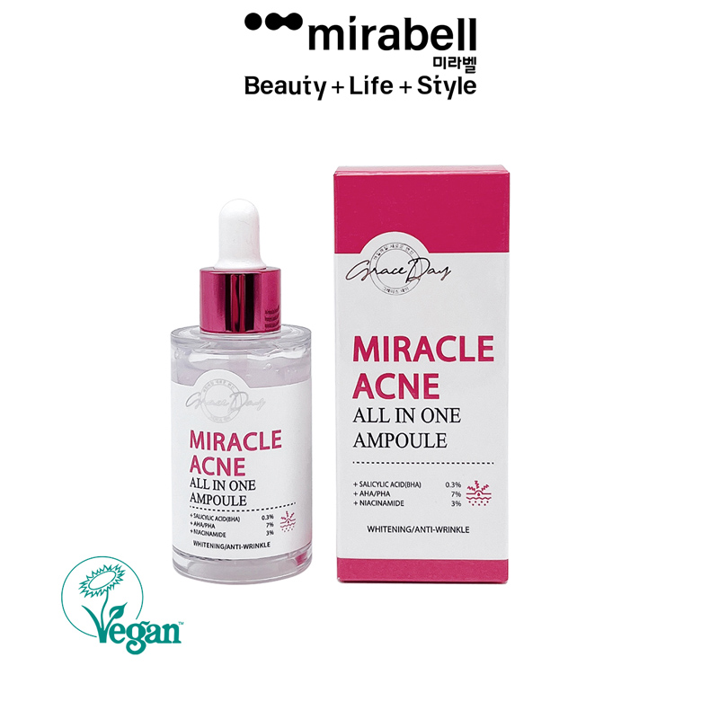 Graceday Miracle Acne All in One Ampoule giúp làm sạch bề mặt da và sạch sâu lỗ chân lông. Chuyên về điều trị các loại mụn như: mụn đầu đen, mụn cám, mụn ẩn, mụn sợi bã nhờn và kiểm soát dầu nhờn trên da. Làm se khít lỗ chân lông, kháng khuẩn, giảm sưng viêm, làm dịu mát da, cải thiện độ đàn hồi của da. Khích thích tái tạo da làm mờ các vết thân nám, tàn nhang.