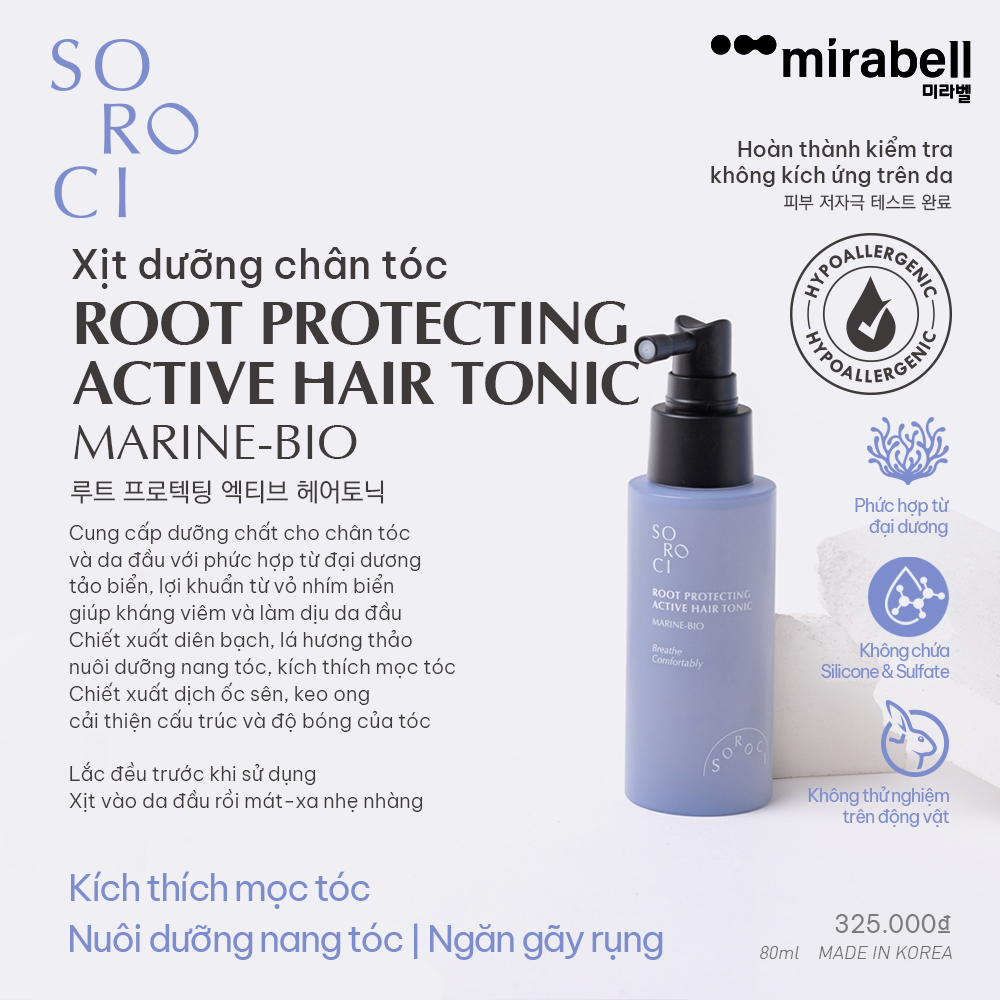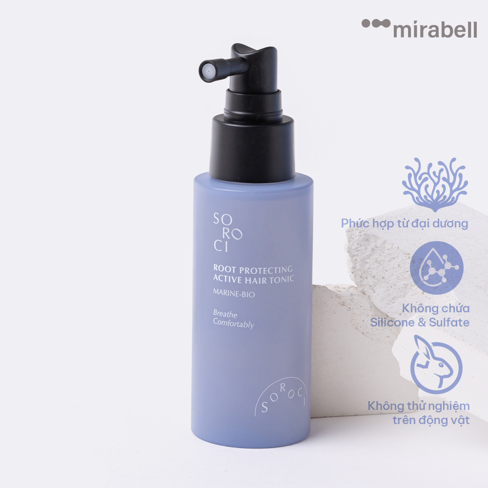 Soroci Root Protecting Active Hair Tonic chứa các dưỡng chất cho da đầu được bào chế từ các phức hợp biển sâu, tăng cường sức khỏe của da đầu, ngăn ngừa rụng tóc hiệu quả, cải thiện độ dày, độ đàn hồi của tóc, giải quyết các vấn đề về gàu và ngứa da đầu mà không gây bết dính
