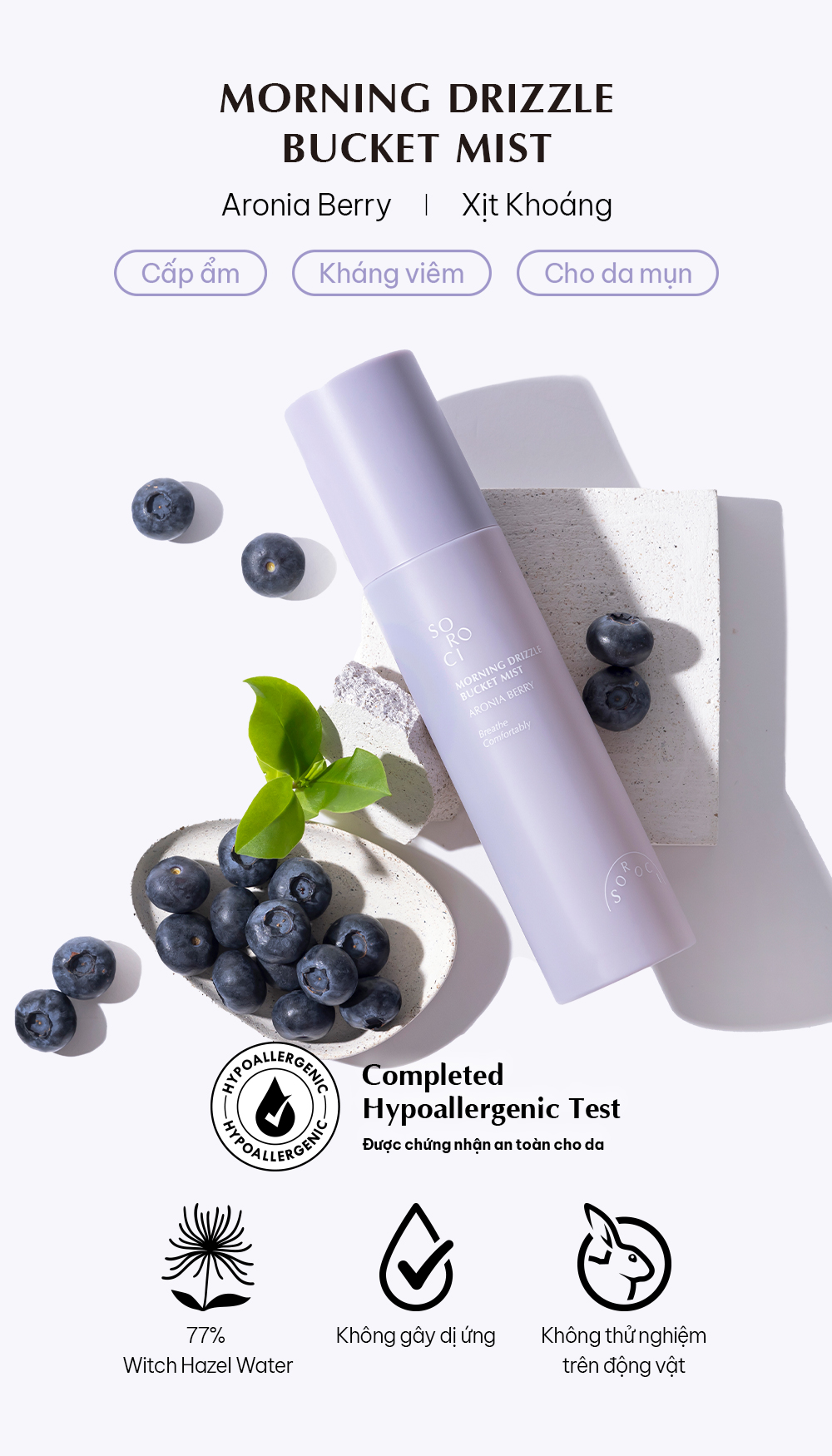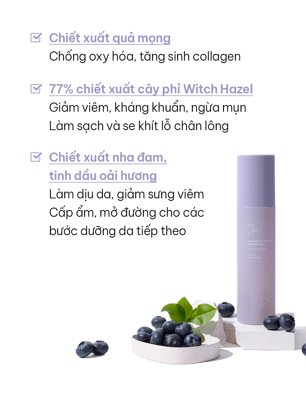Xịt khoáng Soroci Morning Drizzle Bucket Mist chứa 100% chiết xuất từ thực vật: Chiết xuất hoa nhung tuyết và nước cây phỉ giúp cấp ẩm cho da