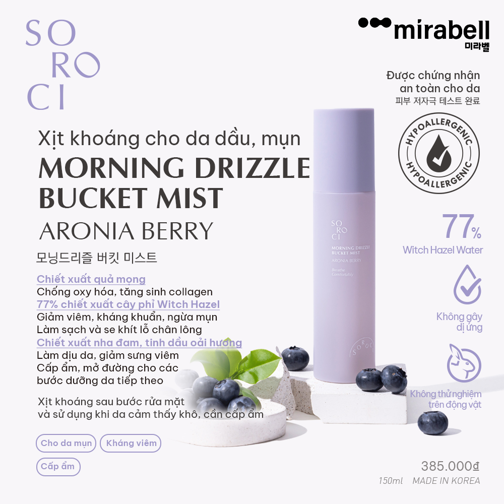 Soroci Morning Drizzle Bucket Mist giàu chất chống oxi hóa từ các chiết xuất thảo dược được lựa chọn cẩn thận. Giúp phục hồi và dưỡng ẩm sâu cho da, giúp da tươi tắn, rạng rỡ